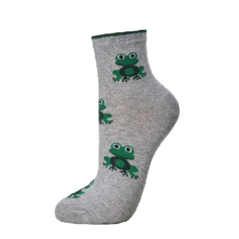 Calcetín tobillero confeccionado en un suave tejido de algodón con divertidos dibujos de ranas. Destaca la comodidad de su puntera sin costuras.
