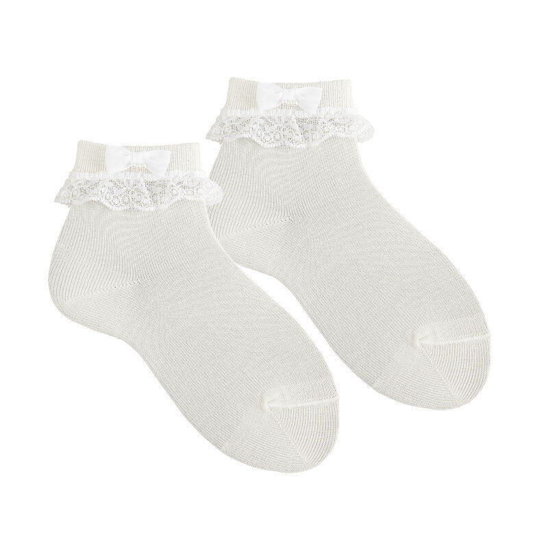 Calcetín tobillero de ceremonia con puño vuelto y acabado de puntilla y lazo con perlita.